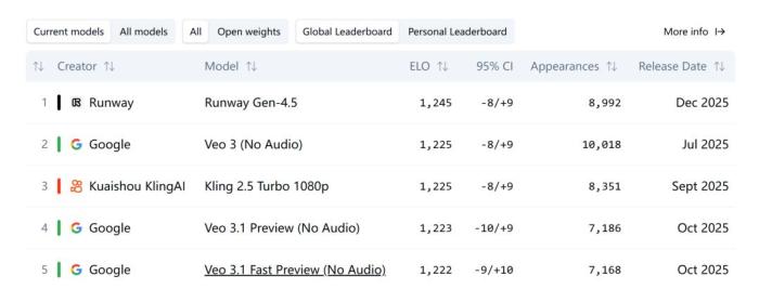 先是Google Veo 3、Veo 3.1凭借原生多模态大模型,实现音画同步和文生视频的提升,成为谷歌又一破圈模型;Runway也在12月2日发布新慢跑鞋gen-4.5,在Artificial Analysis榜单上超过Kling-2.5 Turbo。
