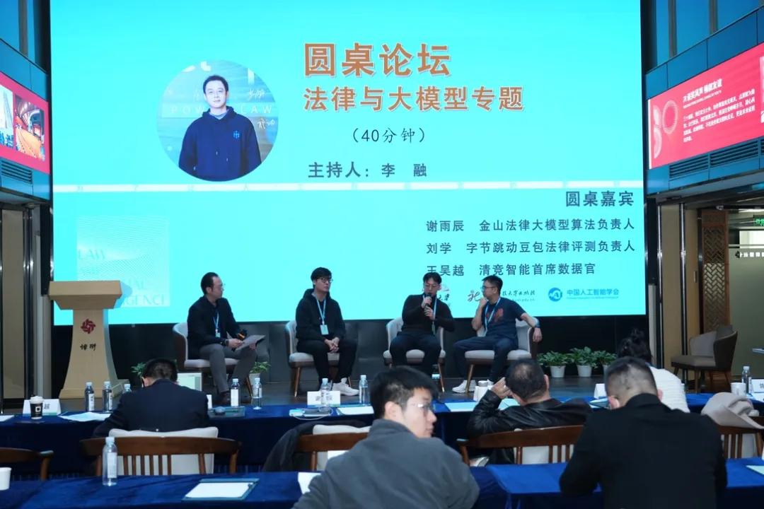 在圆桌环节,李融主持围绕"法律数据评测与大模型"发起对话。嘉宾包括金山云法律大模型算法负责人谢雨辰、字节跳动豆包法律评测负责人刘学、清竞智能首席数据官王吴越三位资深行业专家。