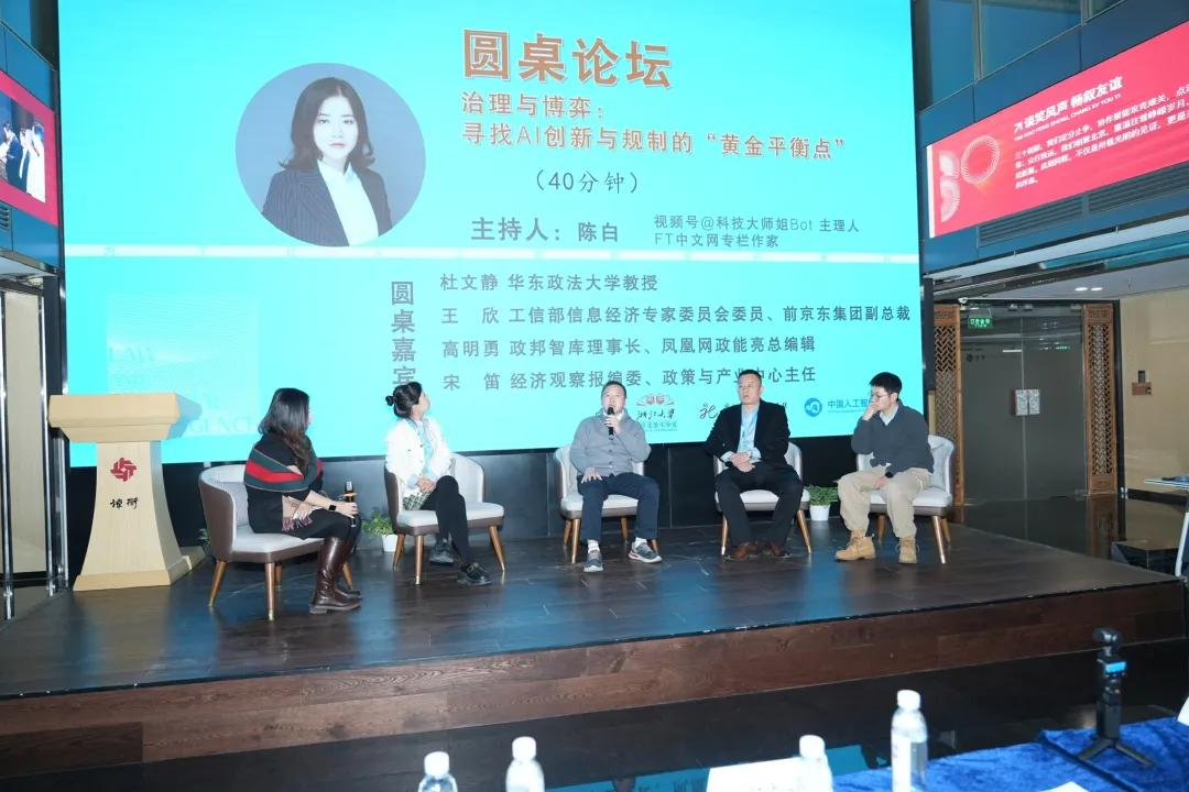 第二场圆桌由FT中文网专栏作家陈白主持,由华东政法大学教授杜文静、工信部信息经济专家委员会委员/前京东集团副总裁王欣、政邦智库理事长/凤凰网政能亮总编辑高明勇、经济观察报编委/政策与产业中心主任宋笛以"治理与博弈:寻找AI创新与规制的'黄金平衡点'"为主题,探讨了人工智能对法律与社会的冲击及应对。