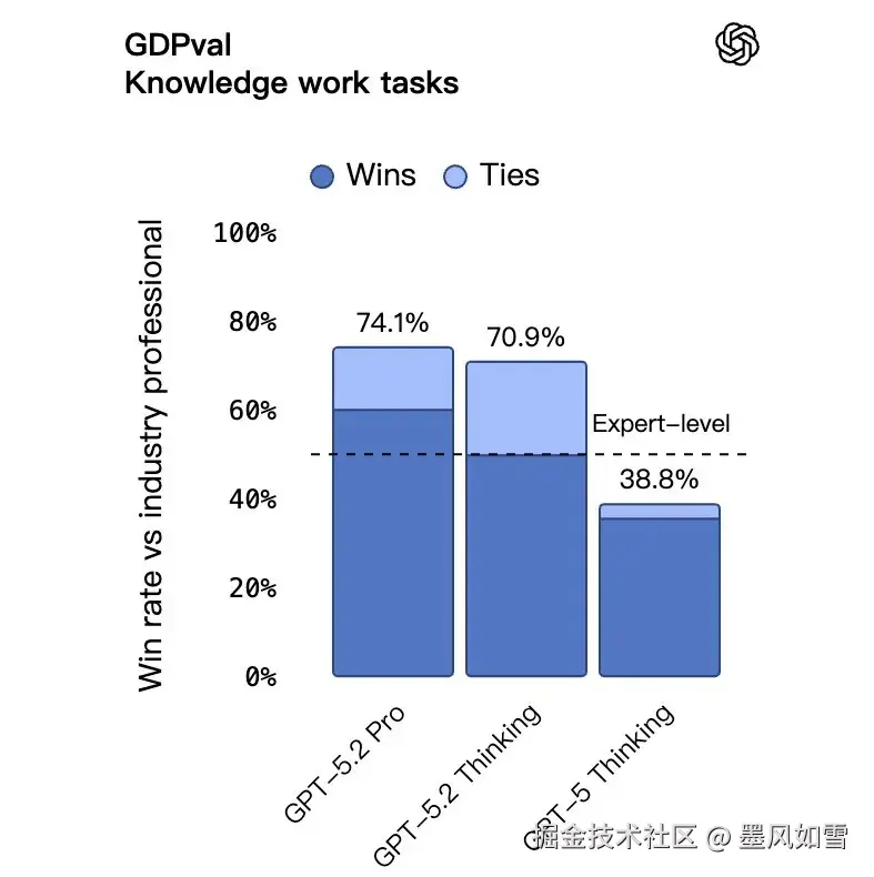 这就不得不提一个新的测试标准------GDPval。这是一个专门评估44种职业知识工作任务的测试。在这个测试里,GPT-5.2在70.9%的情况下,表现得等于或者好于人类行业专家。