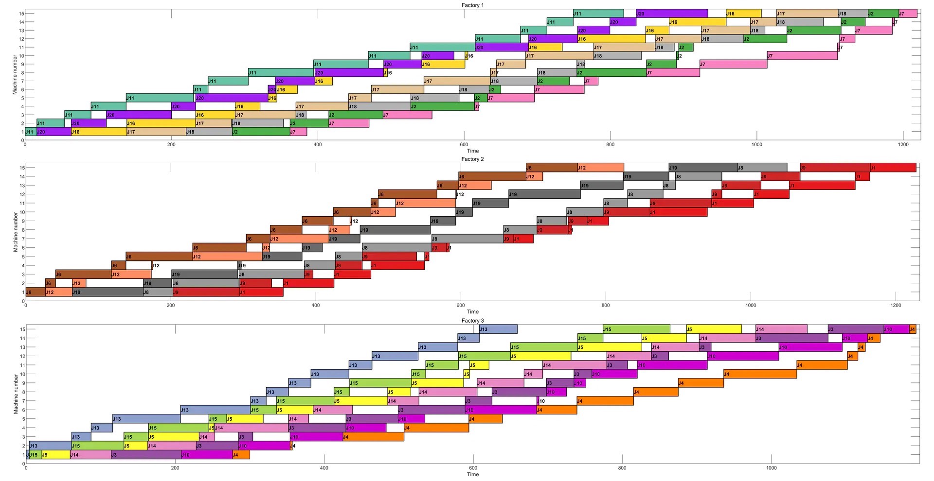 比如下面是一个简单的20工件×15机器、3工厂的调度结果甘特图演示(随机运行一次的结果):