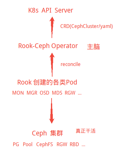 Rook 只需要你:写 yaml 、 Apply、 让 Operator 自动 reconcile。然后所有组件自动出现、自动扩容、自动修复。