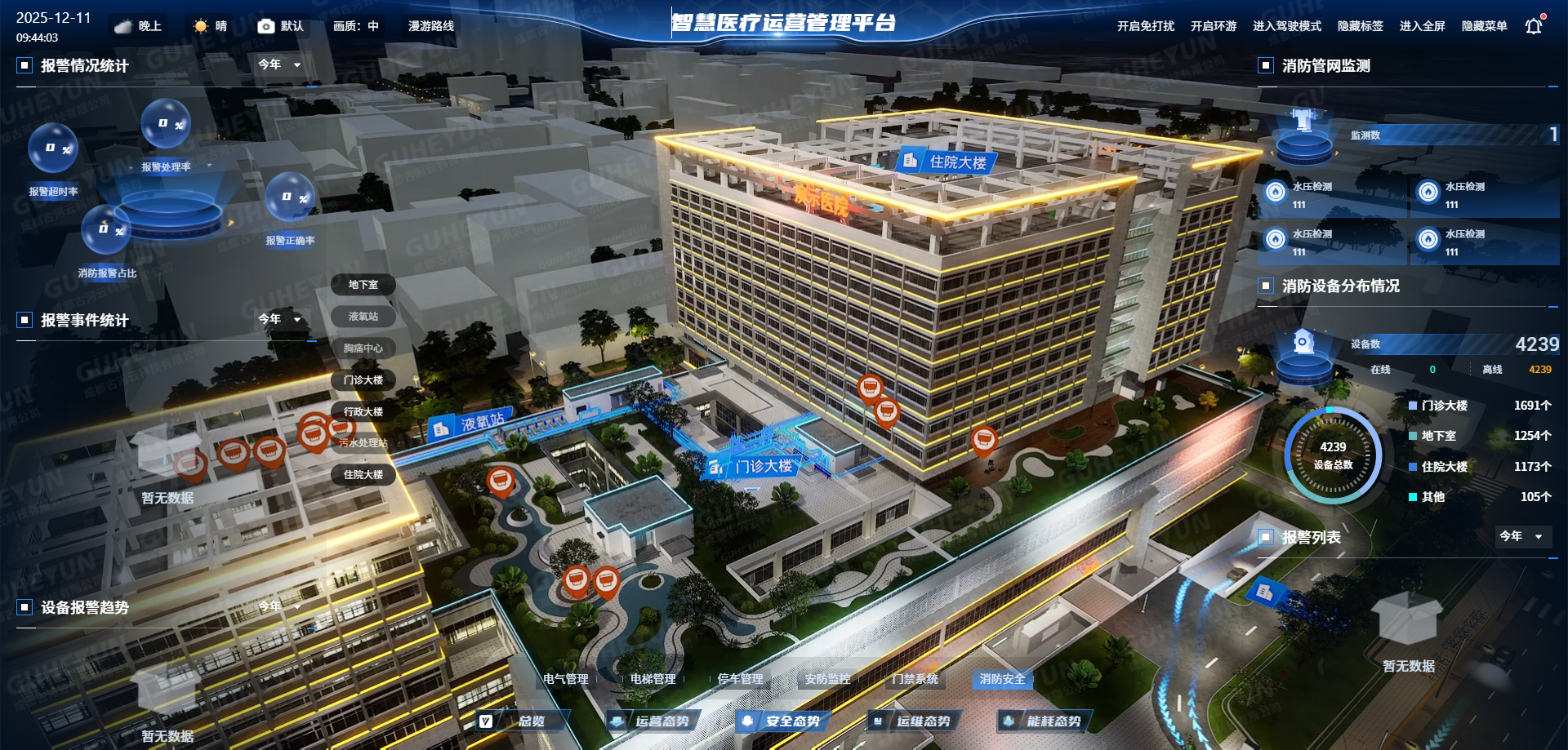数字孪生应用:构建重点单位或区域的3D数字模型,实现设备信息查询、风险点位标注、疏散模拟推演、战术复盘分析等高级应用。