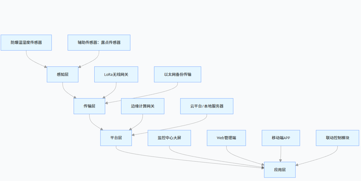 | graph TD A[感知层] --> B[传输层] B --> C[平台层] C --> D[应用层] A1[防爆温湿度传感器] --> A A2[辅助传感器:露点传感器] --> A B1[LoRa无线网关] --> B B2[以太网备份传输] --> B C1[边缘计算网关] --> C C2[云平台/本地服务器] --> C D1[监控中心大屏] --> D D2[Web管理端] --> D D3[移动端APP] --> D D4[联动控制模块] --> D |