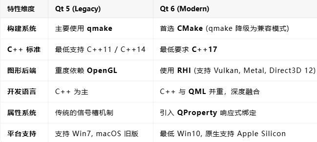 - Qt6 : 强制要求编译器支持 C++17,移除了约 15% 的过时 API(如