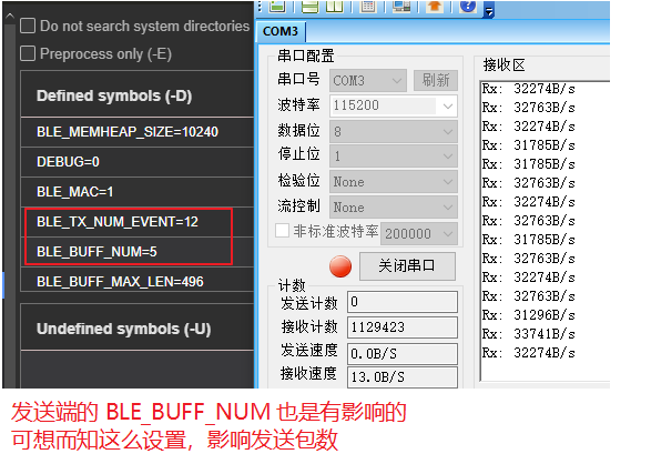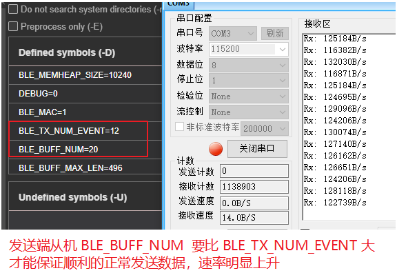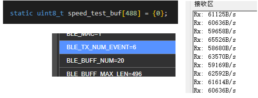 这里的 BLE_BUFF_NUM 要比 BLE_TX_NUM_EVENT 大,BLE_BUFF_NUM 比BLE_TX_NUM_EVENT 大才能正常接收完,要不然设置为几个,一个周期最大只能接收几包 。