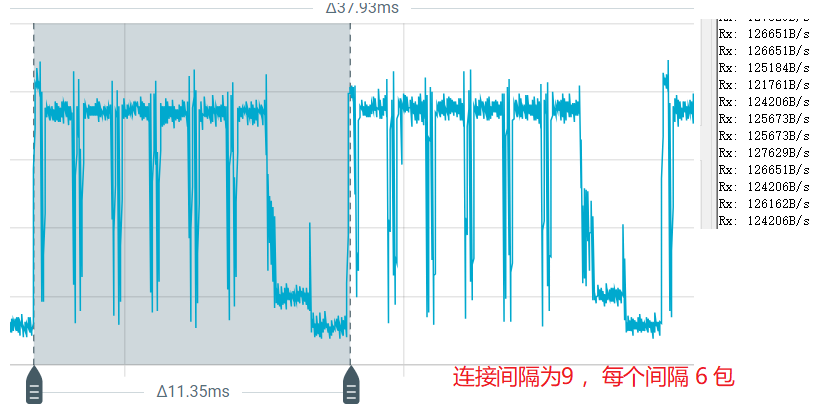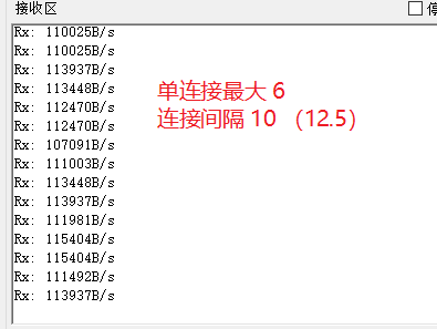在上面我们测试的过程中,如果发包数量为 6 ,只有当连接间隔为 9 的时候,正好发送完成 6包,所以达到了最大的速率。