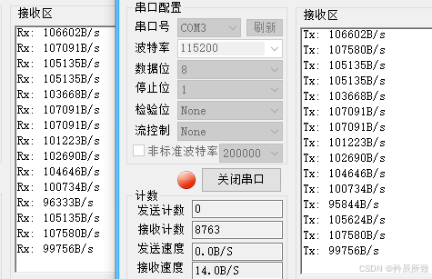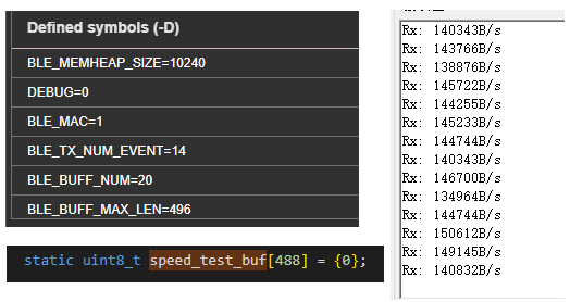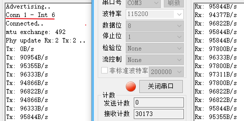 按照示例测试我们得出的 CH585 的 Ble 速率 为 100kB/s 。