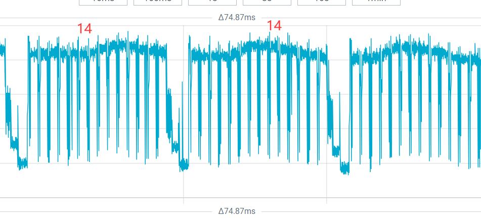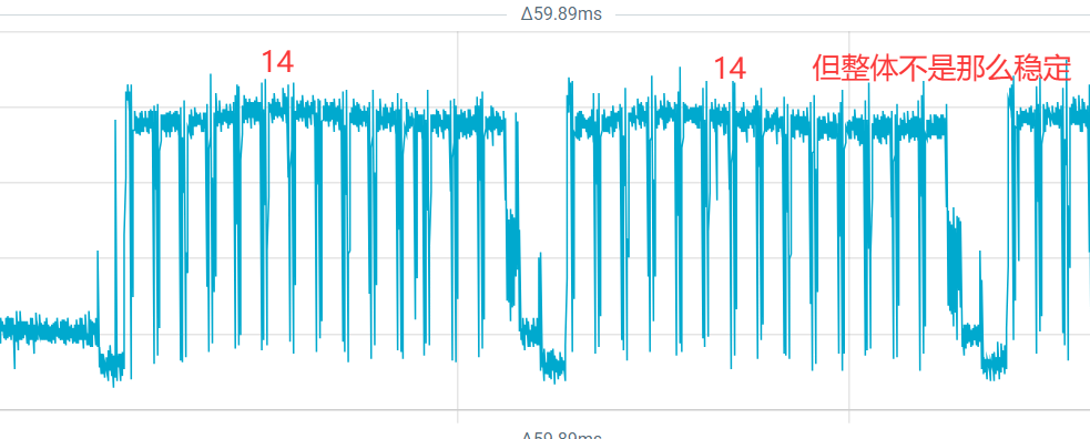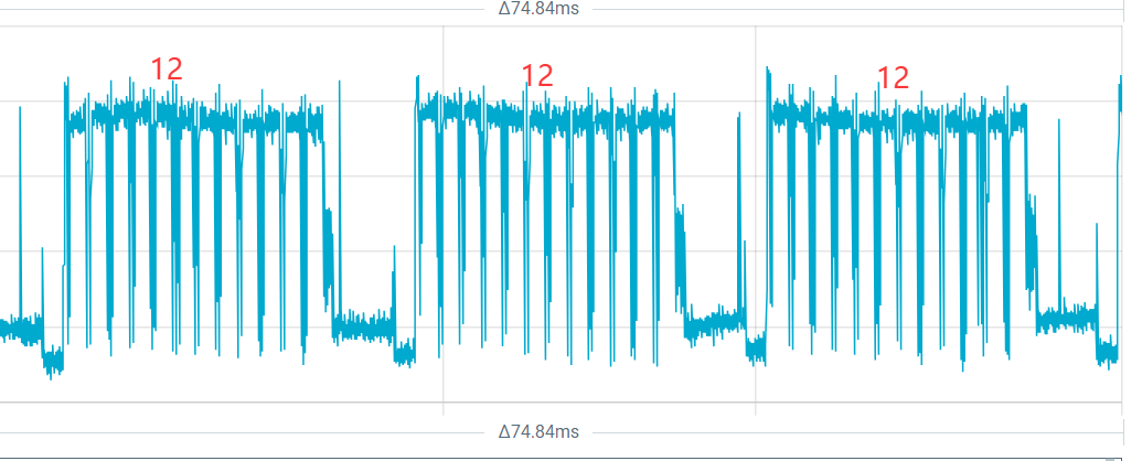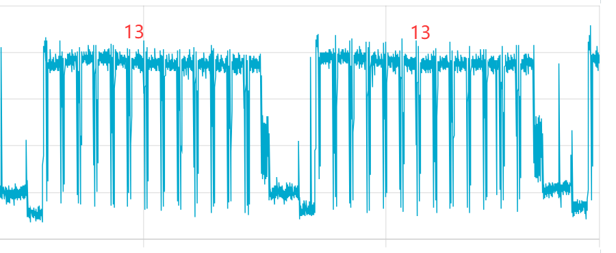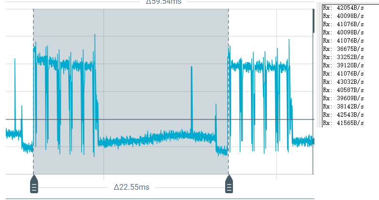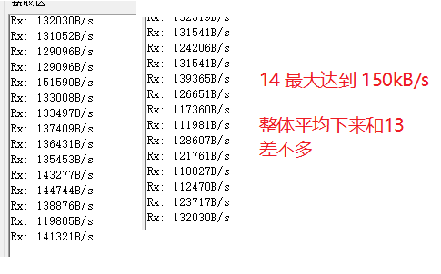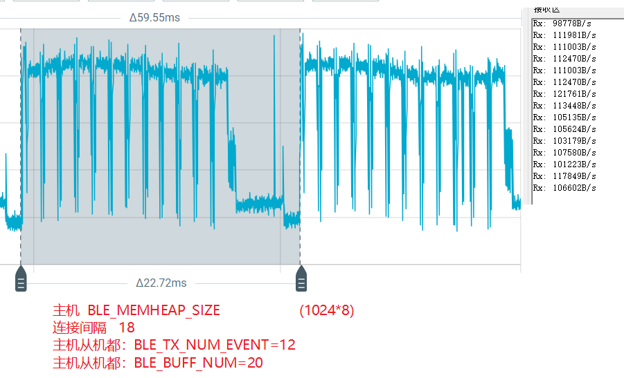 这里的测试明确了几个参数的设置关系,测试下来,并不会比我们最开始那种设置速率有提升。但是!!!我们是按照最初的连接间隔和包数判断,连接间隔18 肯定可以发完 12 包,我们才设置的 12 包,通过上面的图像我感觉还可以多1包,于是我把发送端的包数在上面的基础上改成了 13 :