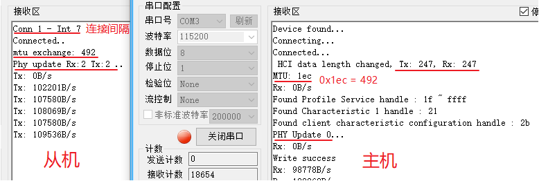 上面测试是需要两块板子: 一主,一从机 。(手机或者 PC 也可以连接从机测试,但是因为配置问题,速度比官方测试主机例程慢很多,这个在下文会有探讨)。