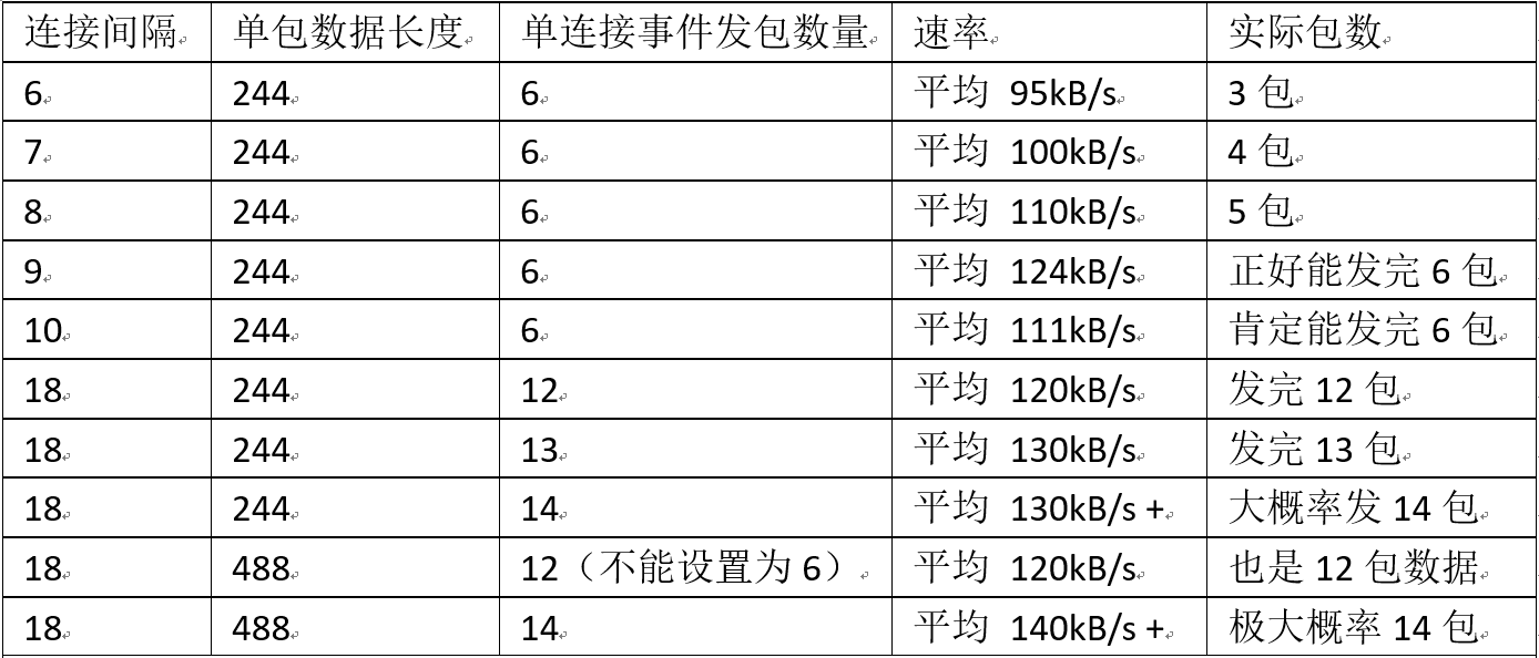 实际上通过上面的测试,结合上文的分析,我们可以推测,只要在一个连接间隔内,完美的把能够发送的数据的时间全部利用上(因为还有一些时间协议栈需要拿来处理一些自己的流程,比如睡眠,唤醒,校对时间等),就能够达到一个最大的速率。