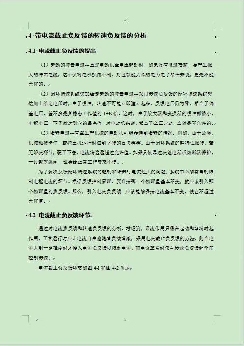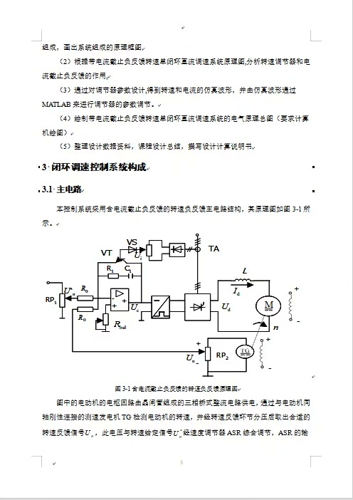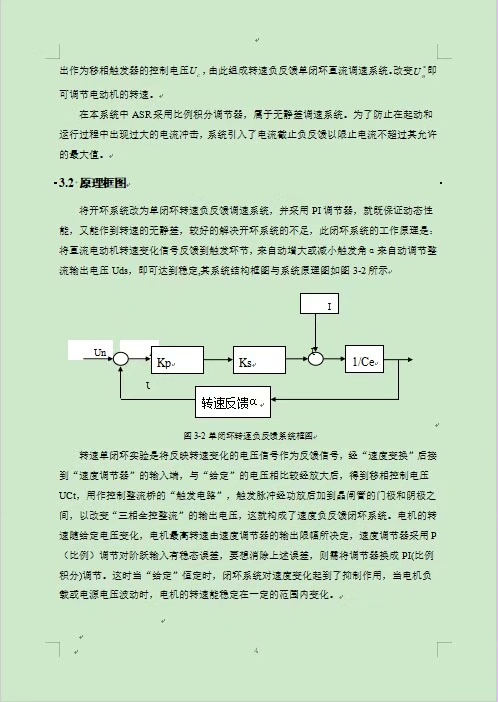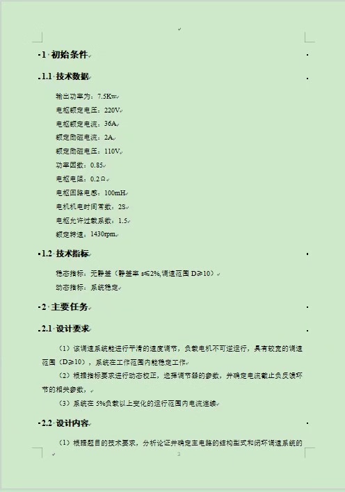 基于MATLAB的单闭环直流调速系统设计 本设计包括设计报告,仿真电气接线图。 设计要求 (1)该调速系统能进行平滑的速度调节,负载电机不可逆运行,具有较宽的调速范围(D≥10),系统在工作范围内能稳定工作 (2)根据指标要求进行动态校正,选择调节器的参数,并确定电流截止负反馈环节的相关参数, (3)系统在5%负载以上变化的运行范围内电流连续