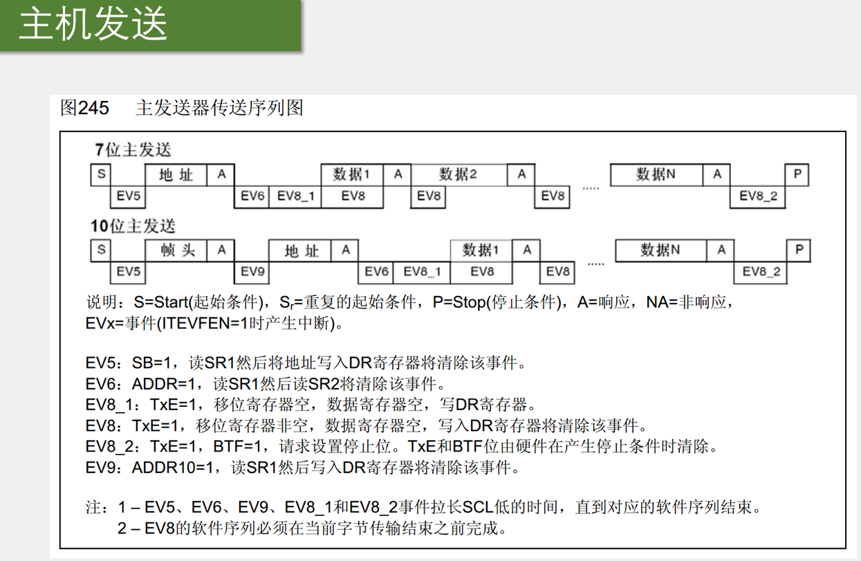 EV8_2:很简单就是说在TxE=1和BTF=1,就是说移位寄存器在工作,数据寄存器是空的,然后结束传送,然后状态寄存器中的TxE=1和BTF=1被硬件自动清除