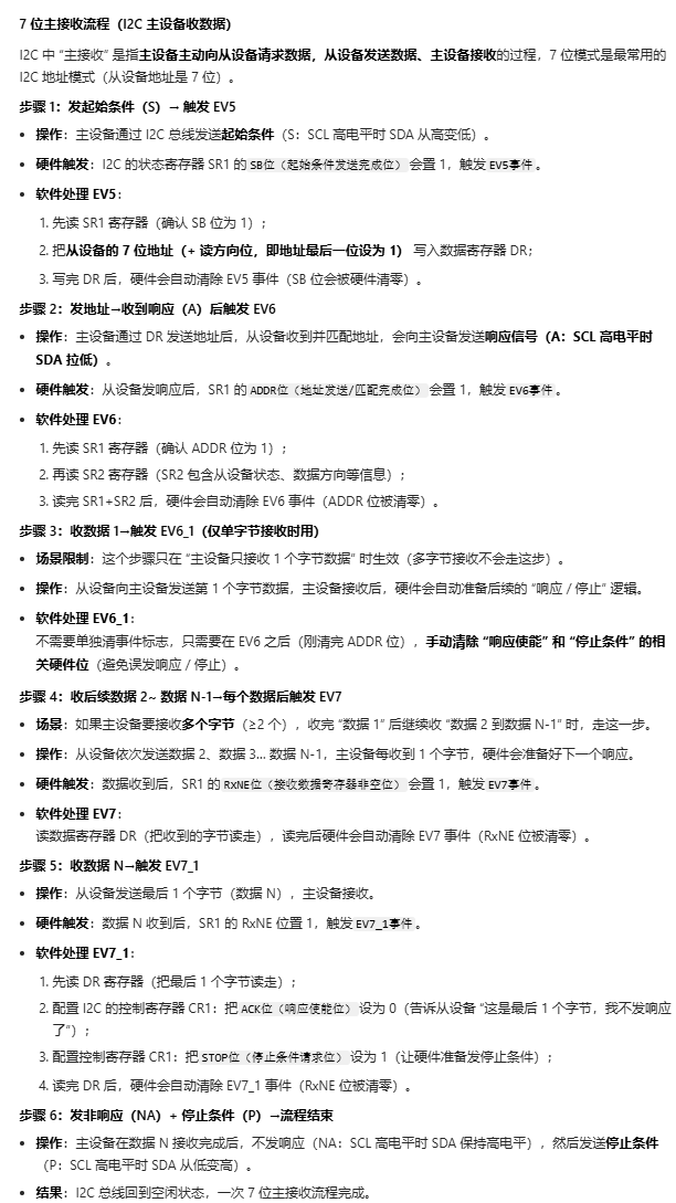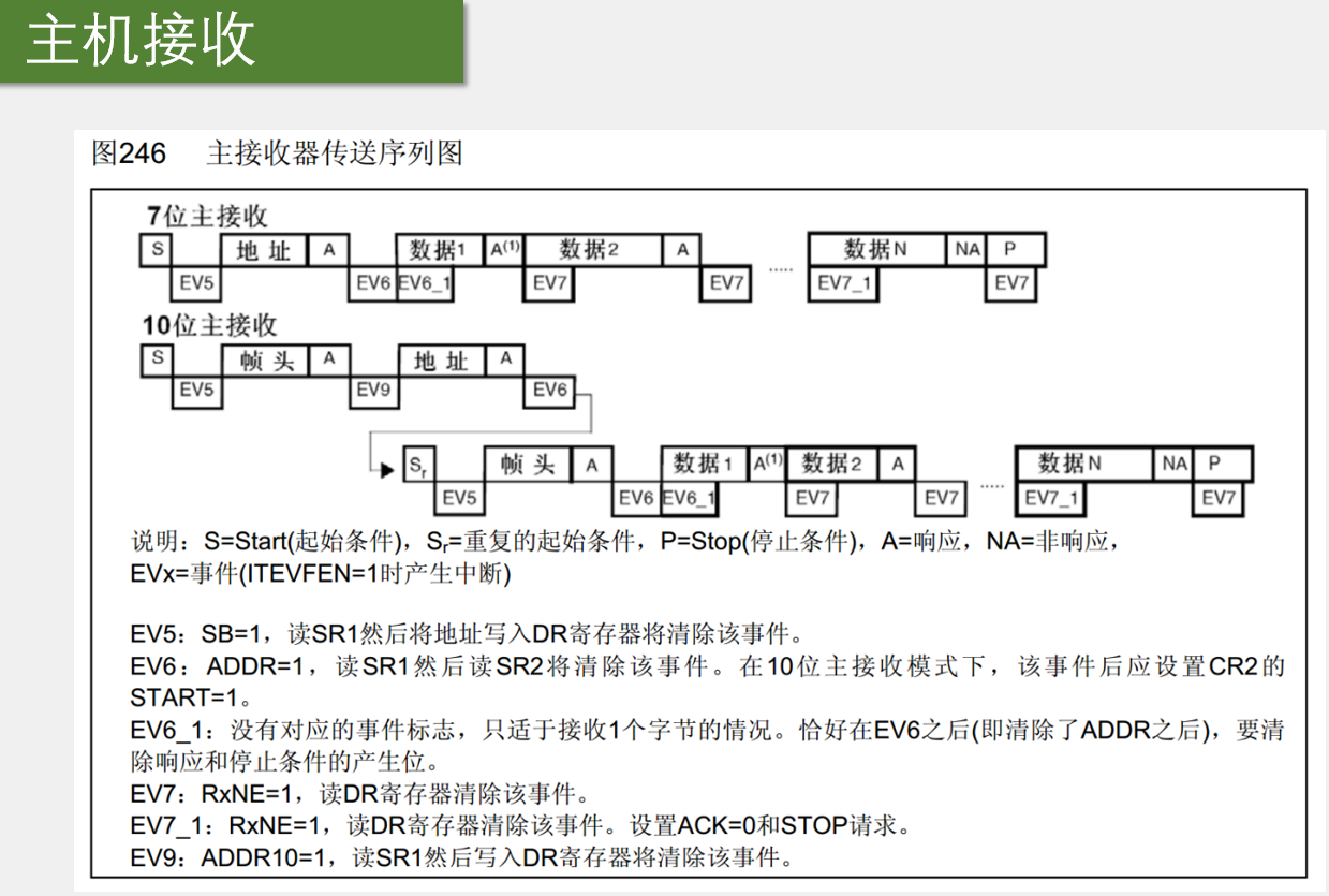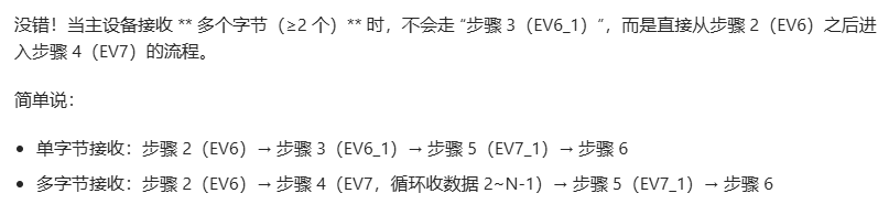 EV6:ADDR=1的意思就是,从机已经收到地址,然后发了应答信号A,主机读到了这个信息,然后硬件自动将SR1和SR2清楚
