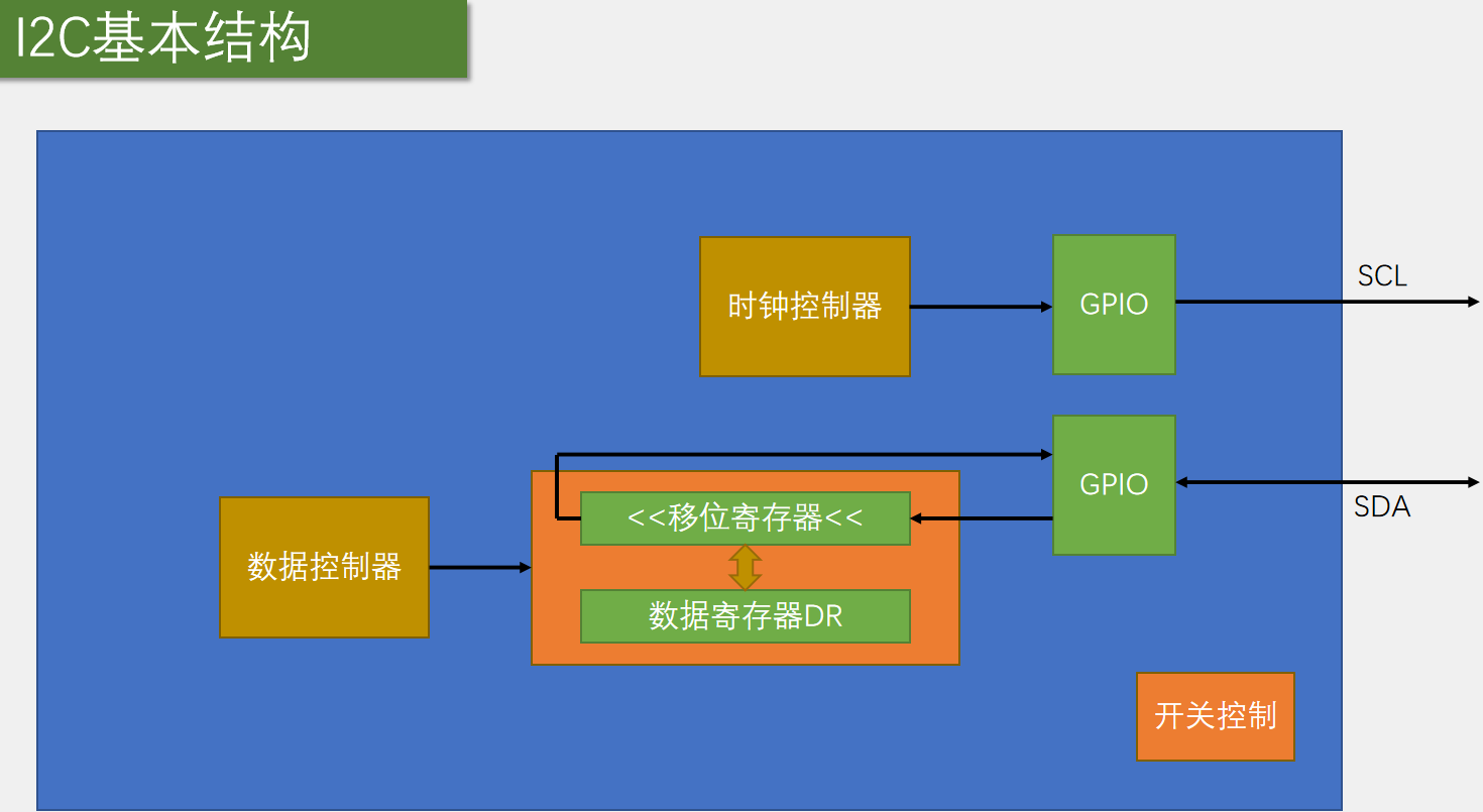 这个功能框图还是很好理解的吧,首先看上面的SDA,可知的是,比较器和帧错误校验这一块目前是不用的,这两块是STM32本身作为从机的时候进行校验地址位用的
