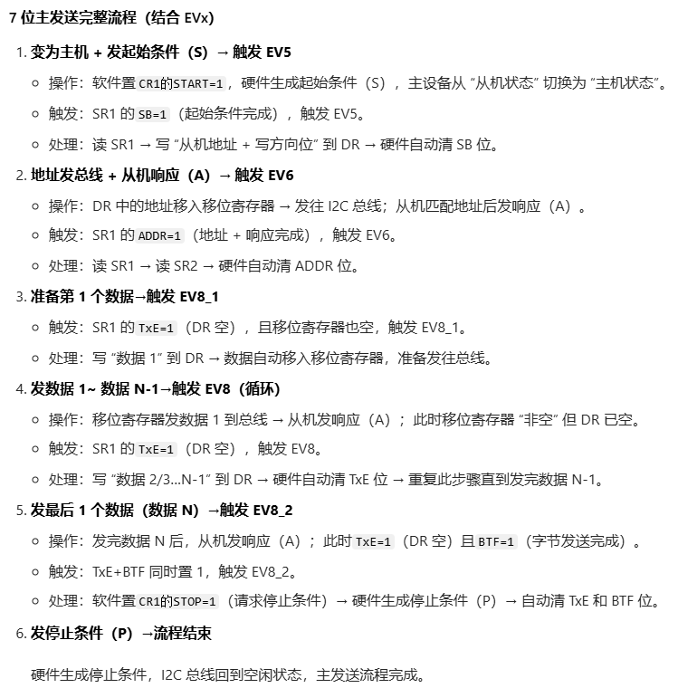 EV8_1:首先TxE=1的意思就是状态寄存器表明数据寄存器空了,该往里面填写东西了,后面就很好理解了,开始往数据寄存器写东西了