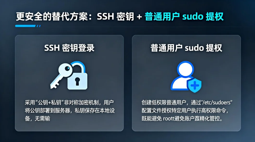 更安全的替代方案:SSH 密钥 + 普通用户 sudo 提权