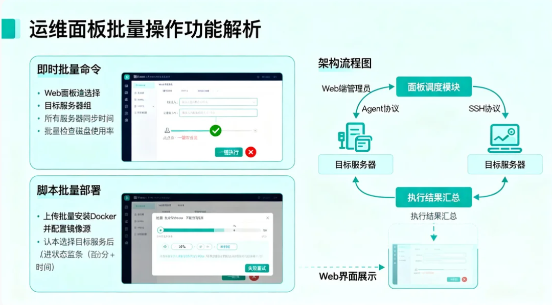架构描述 :面板工具通过 Agent 或 SSH 协议与服务器建立连接,管理员在 Web 端下发指令,由面板的调度模块分发至目标服务器,执行结果汇总后展示在 Web 界面,实现"一次操作,多机生效"。