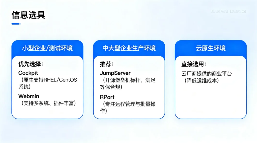 | 轻量级开源工具 | Cockpit、Webmin | 10 台以内小规模服务器集群 | 部署简单、轻量无Agent、适合入门级运维 |