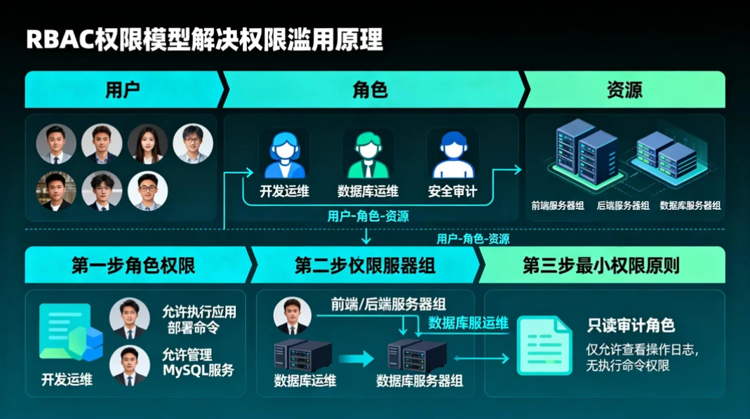 - 创建用户组与角色:根据运维职责划分角色,如"开发运维""数据库运维""安全审计",为不同角色分配不同权限(如"开发运维"仅允许执行应用部署命令,"数据库运维"允许管理 MySQL 服务);