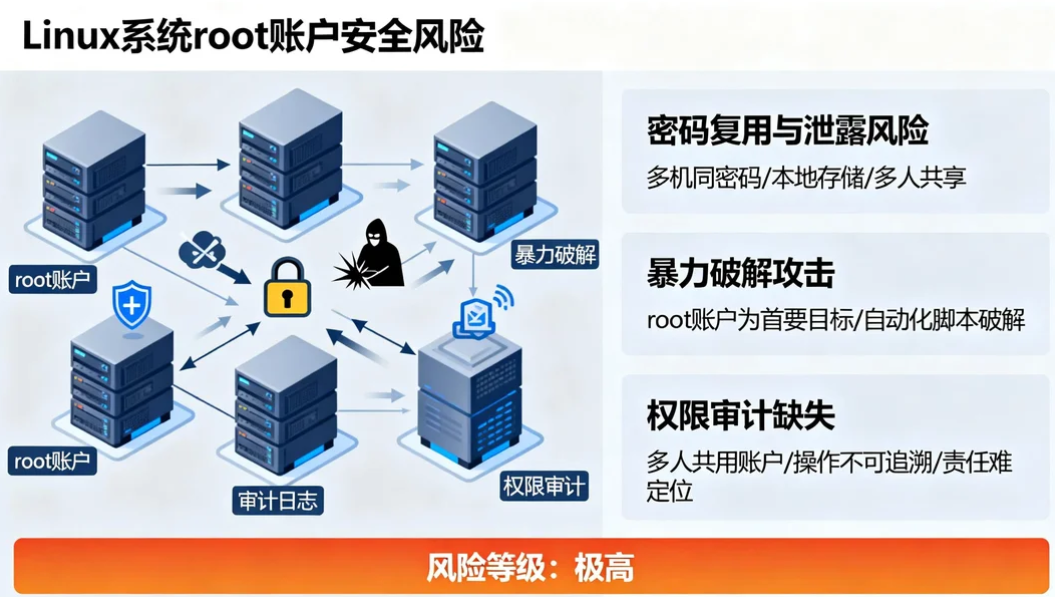 root 账户作为 Linux 系统的最高权限账户,一旦泄露或被攻破,攻击者可直接掌控整台服务器,造成数据篡改、系统瘫痪等不可逆损失。在多机环境中,root 密码登录的风险被进一步放大: