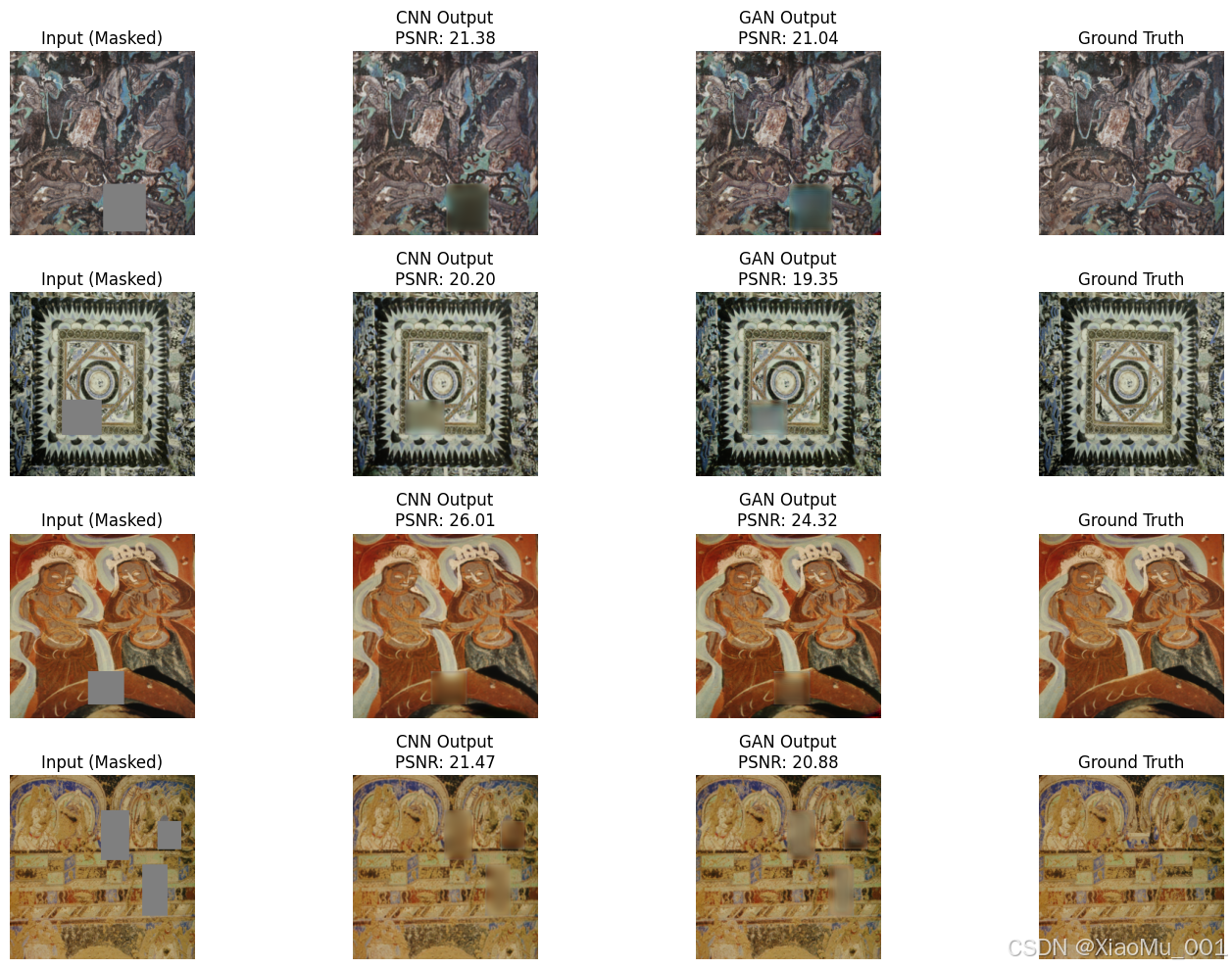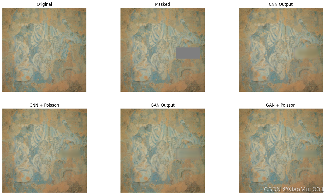 - CNN Result:修复了结构,但细节较模糊平滑。