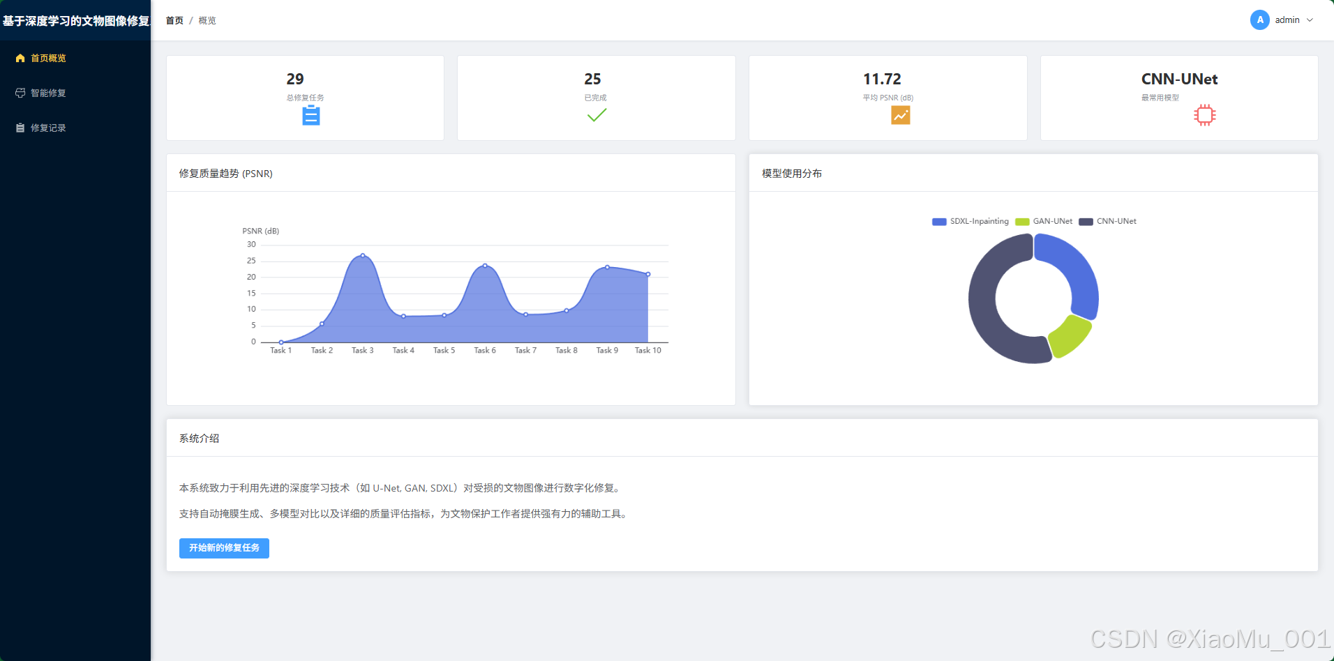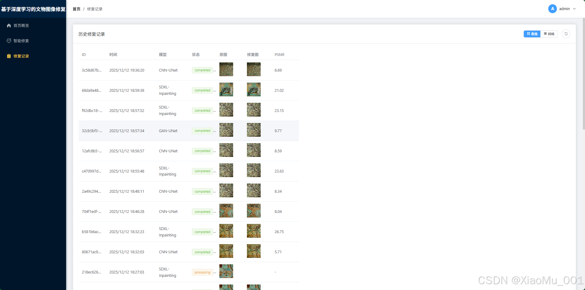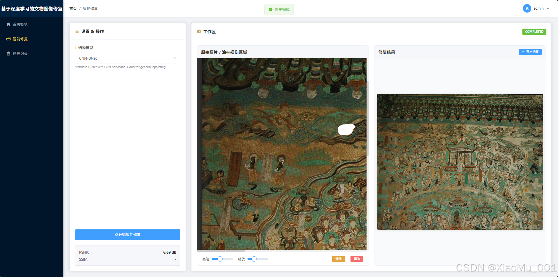 本项目旨在利用计算机视觉 和深度学习技术,构建一个自动化的文物图像修复系统。通过学习大量文物图像的纹理和结构特征,算法能够智能地推断并填补缺失区域,不仅能提高修复效率,还能为文物保护工作提供有力的辅助工具。