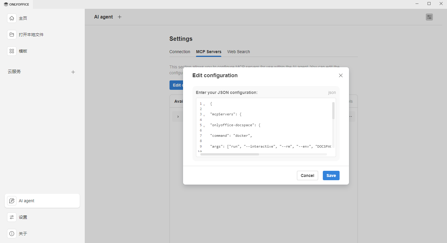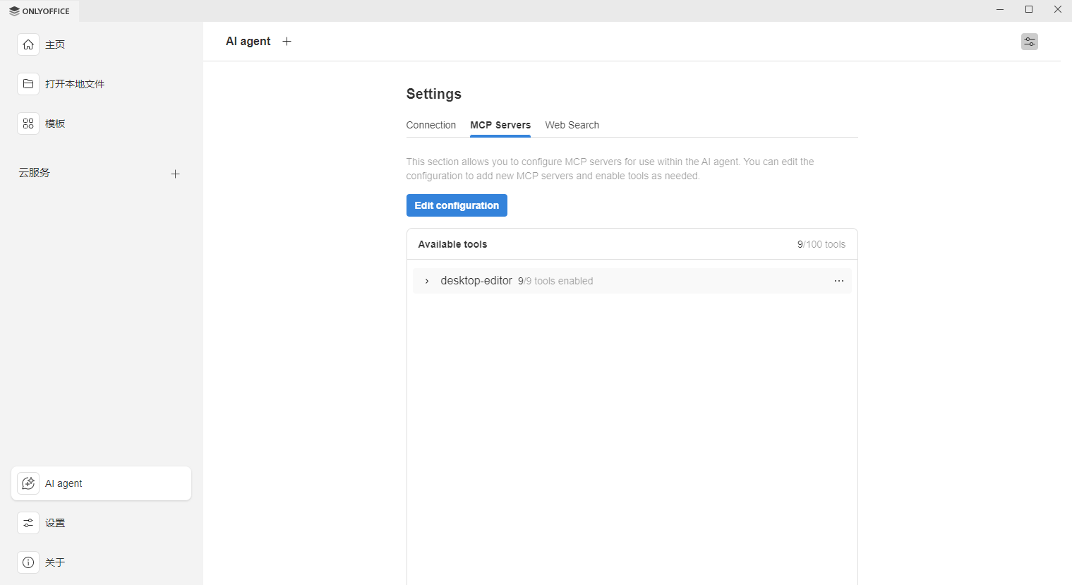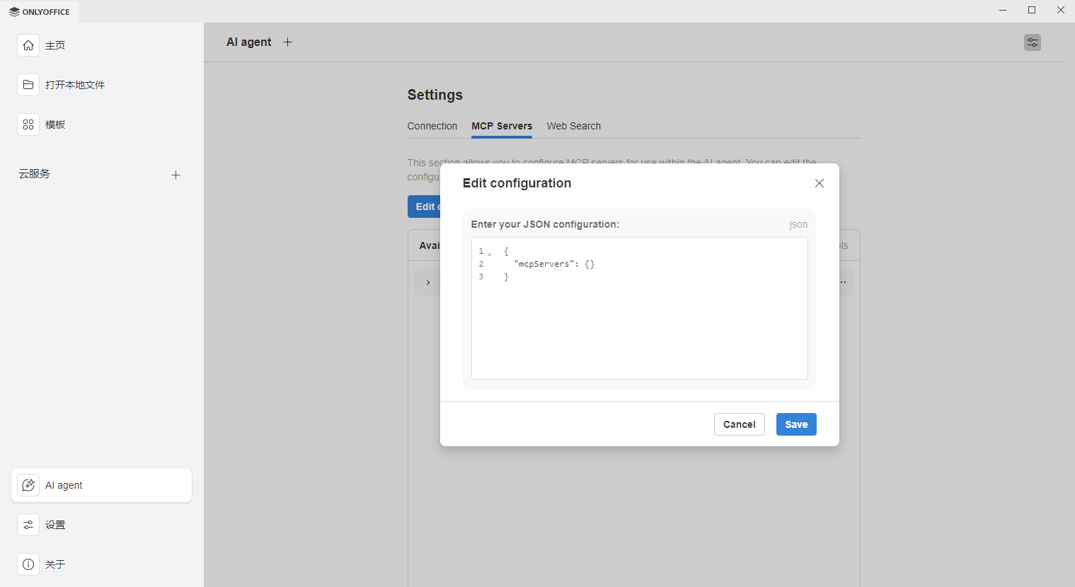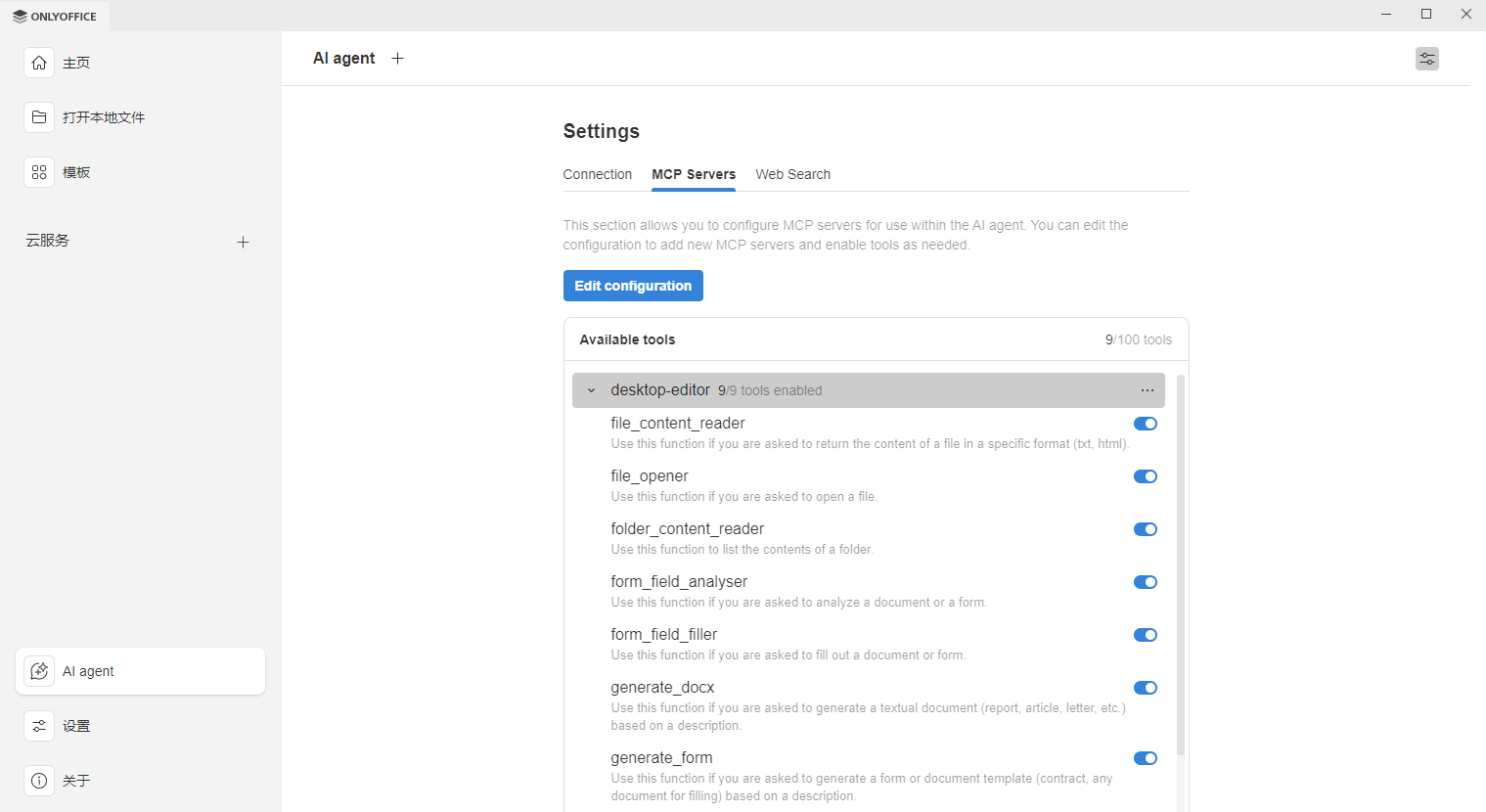 ONLYOFFICE 桌面编辑器内置了一些 MCP 工具,您还可以通过简单的 JSON 配置来添加与其他服务器的连接。