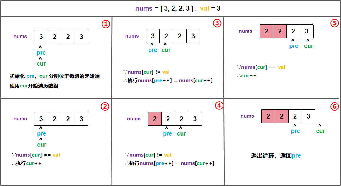 nums[cur] != val,则执行nums[pre++] = nums[cur],并执行cur 自增加1。 - 当cur 指向数组的末尾时,终止循环,返回pre即可;