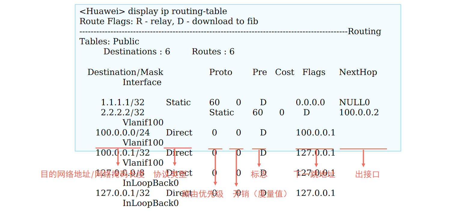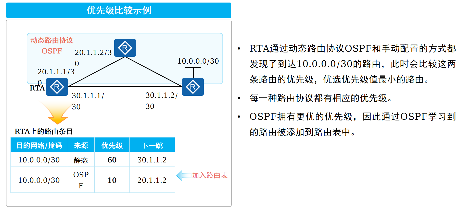 不同的协议类型,都是到同一目的网段,这个时候看各自的优先级,哪条优先级高(pre的值越小)则哪条加入路由表;