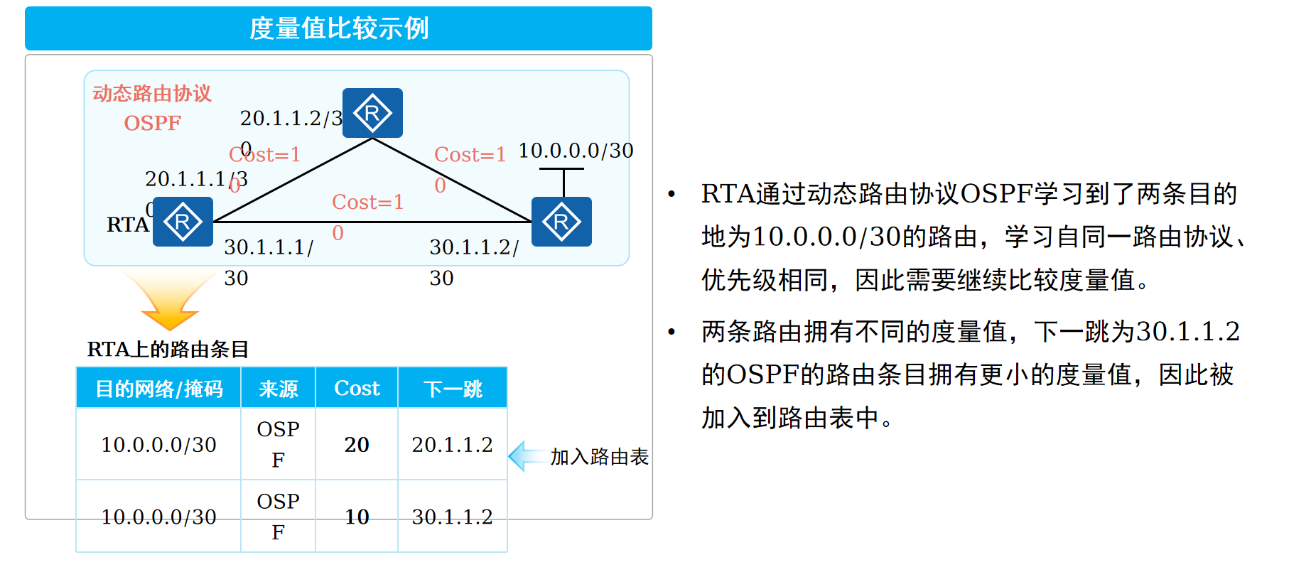 相同的协议类型,都是到同一目的网段,这个时候看cost开销值,哪条的开销值小,就选择哪条;