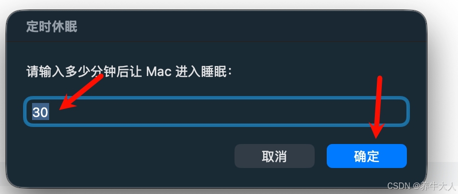 set theMinutes to text returned of (display dialog "请输入多少分钟后让 Mac 进入睡眠:" default answer "30" buttons {"取消", "确定"} default button "确定" cancel button "取消" with title "定时休眠")