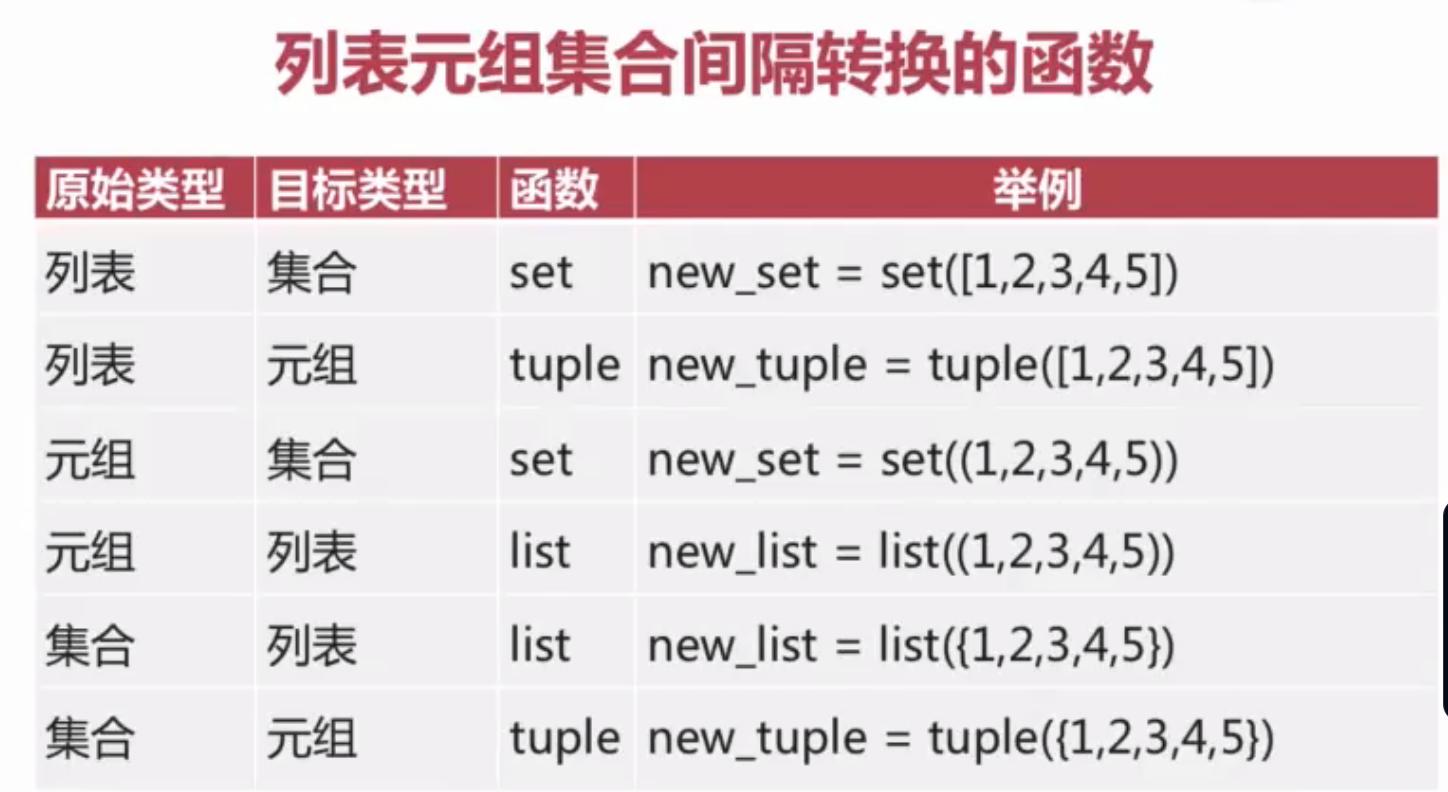 - [列表 元组 集合间的转换](#列表 元组 集合间的转换)