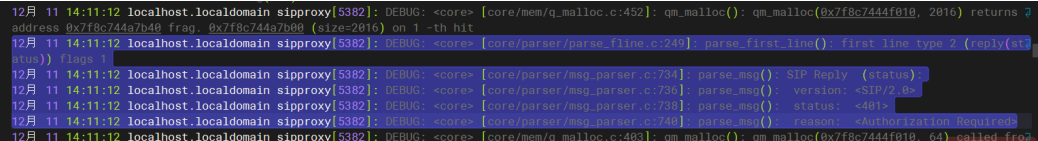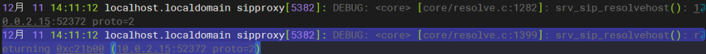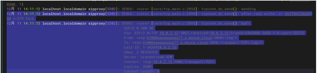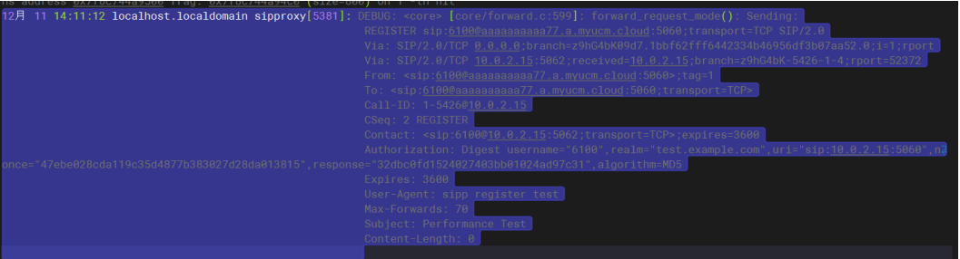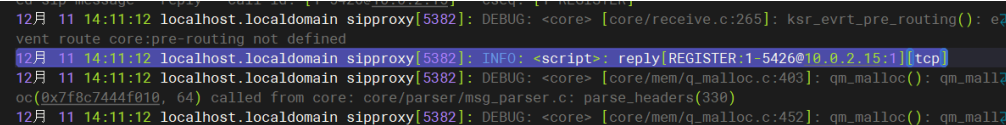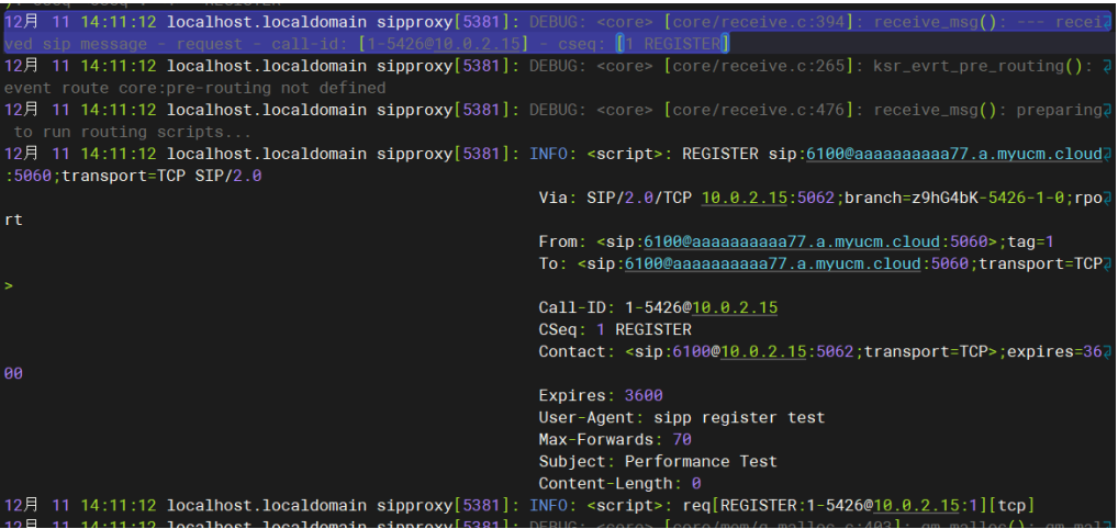 演示:./register_test.sh 1 10.0.2.15:5060发起一个注册请求,查看日志进行分析: