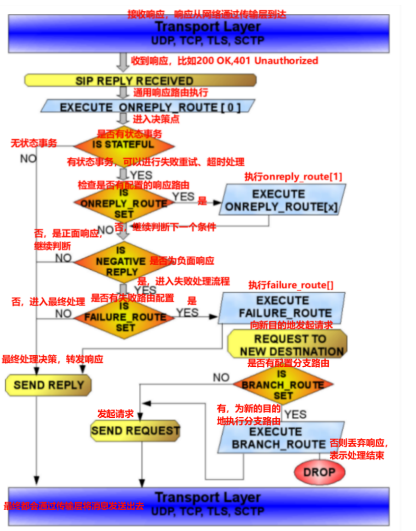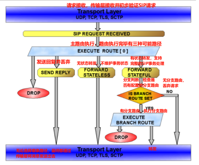 Kamailio配置文件的执行在收到来自网络SIP请求和SIP回复的处理流程不同。