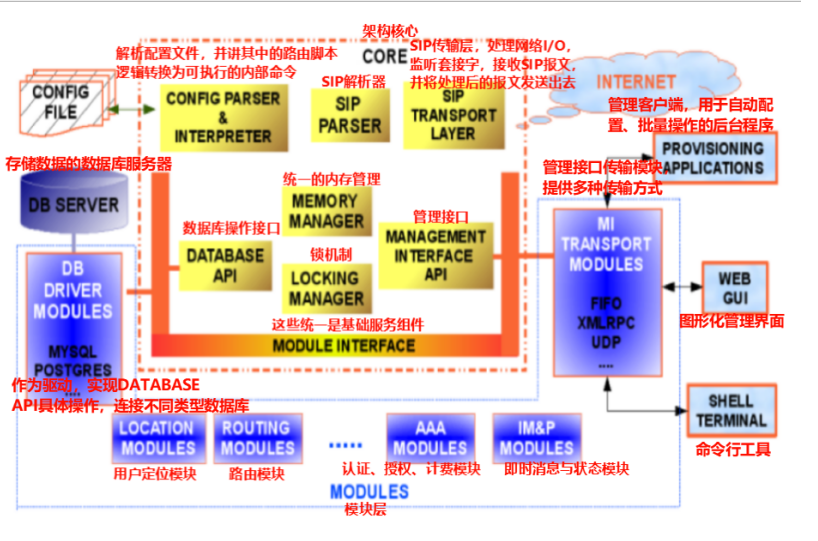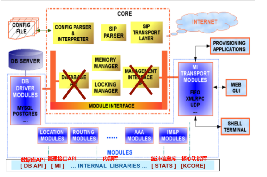 Kamailio v3.0.x(或更新版本)的架构进行了重构,把原本核心的数据库API、管理接口API移出,重构为内部库