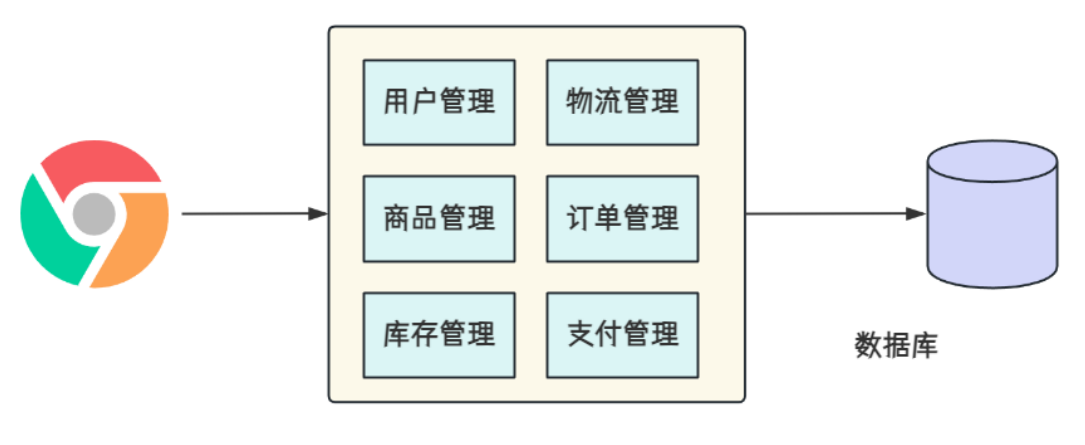 很多创业公司早期或者传统企业会把业务的所有功能实现都打包在⼀个项⽬, 这就是单体架构. 业务的所有功能实现都打包在⼀个war包或者Jar包中, 这种⽅式就称为单体架构