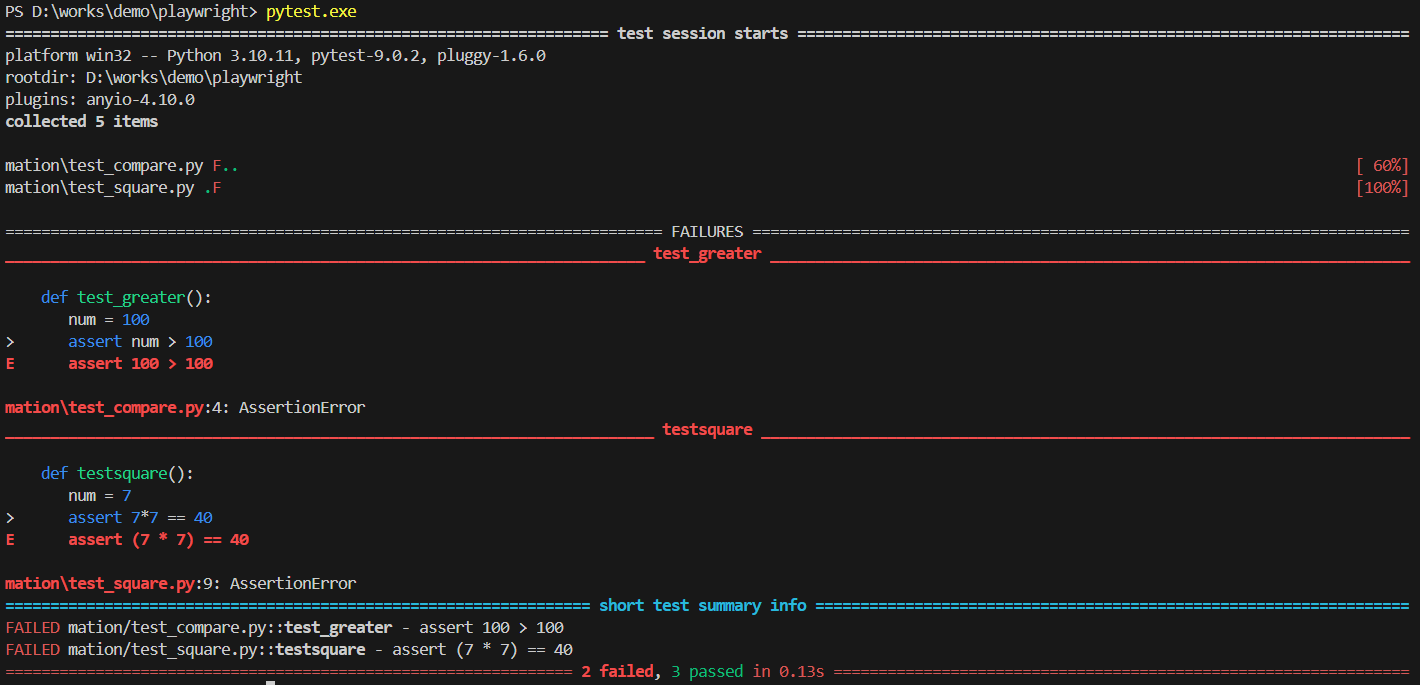 =============================================================== 2 failed, 3 passed in 0.13s ================================================================