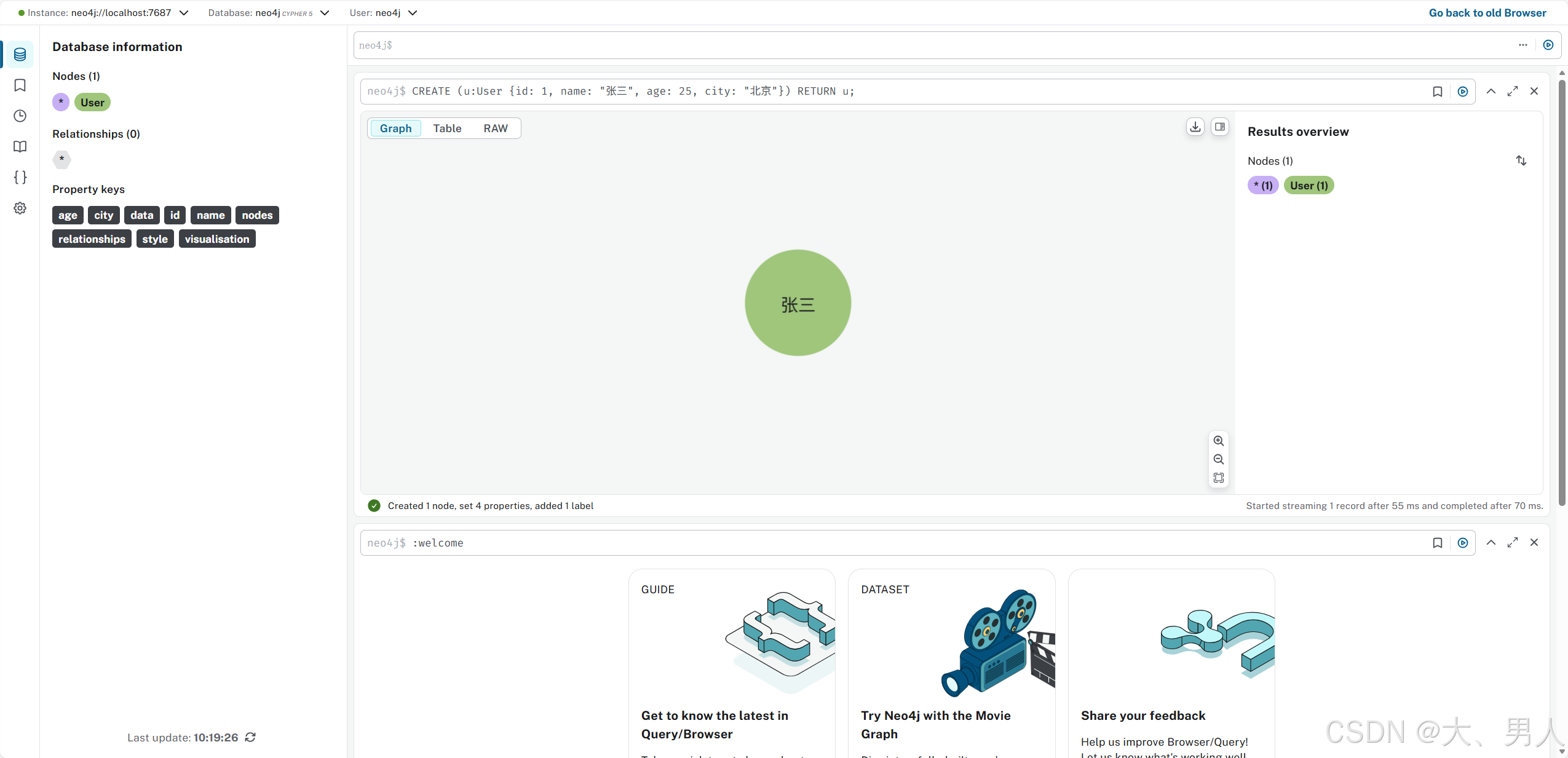 CREATE (u:User {id: 1, name: "张三", age: 25, city: "北京"})