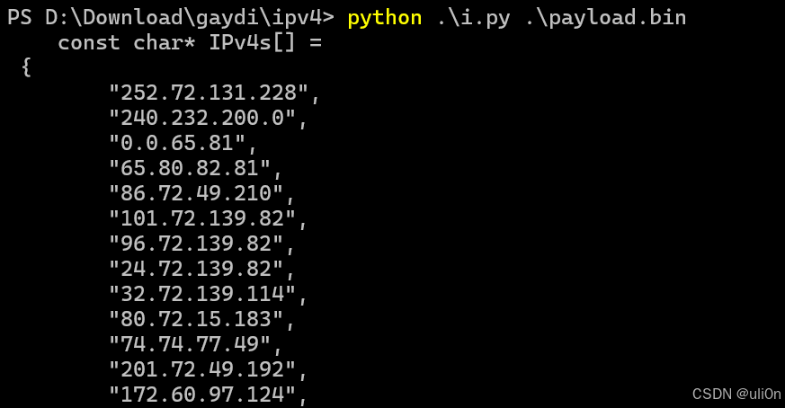 - 还是一样,可以通过下面的代码将ShellCode转换为IPv4的地址: