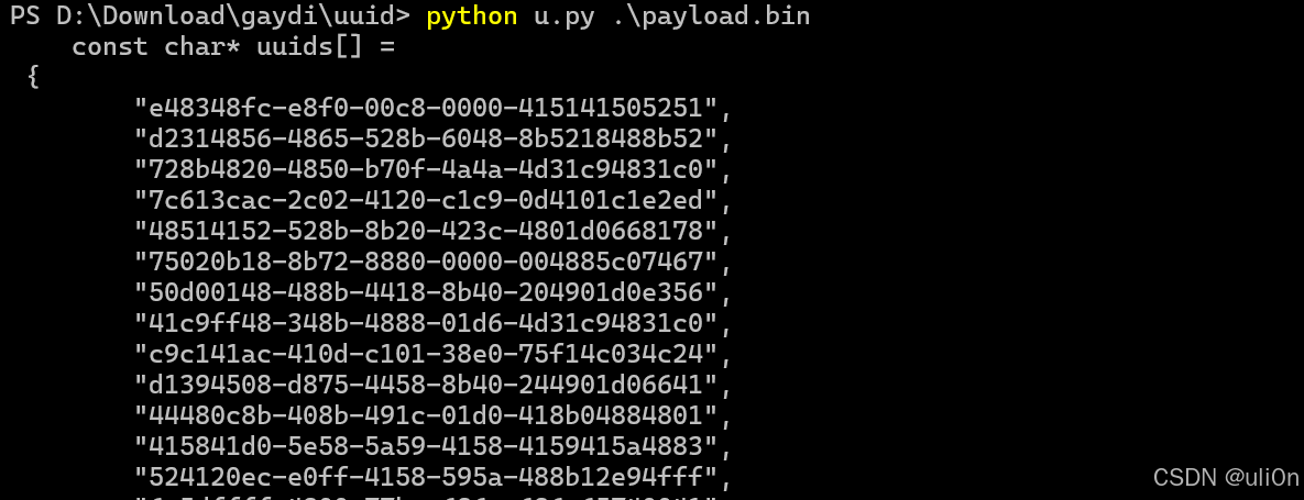- 我们可以通过Python脚本去生成UUID形式的ShellCode: