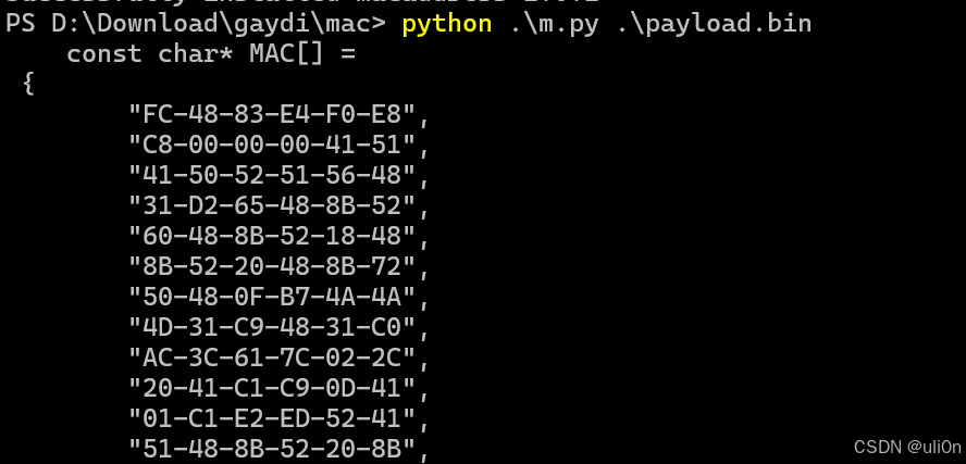 - 同理,我们也可以将ShellCode混淆为MAC地址,使用如下脚本: