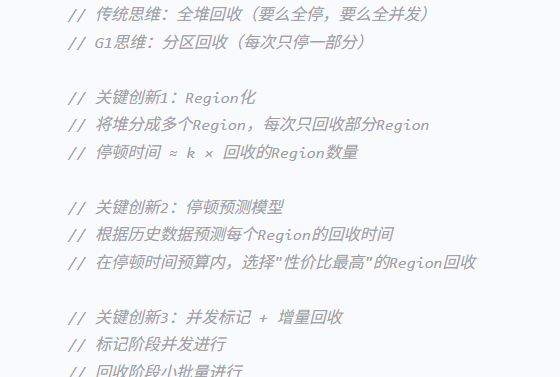 G1旨在为大内存、多核CPU的现代服务器应用提供可预测的、相对较短的停顿时间,同时保持较高的吞吐量,它通过Region化分区、停顿时间预测模型和增量式并发回收机制,在大堆内存管理上取得了吞吐量与延迟的最佳平衡。