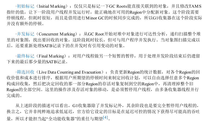 微观:每次回收,将选中Region(回收集)的存活对象复制到空闲Region,然后清空回收集。这是复制算法。