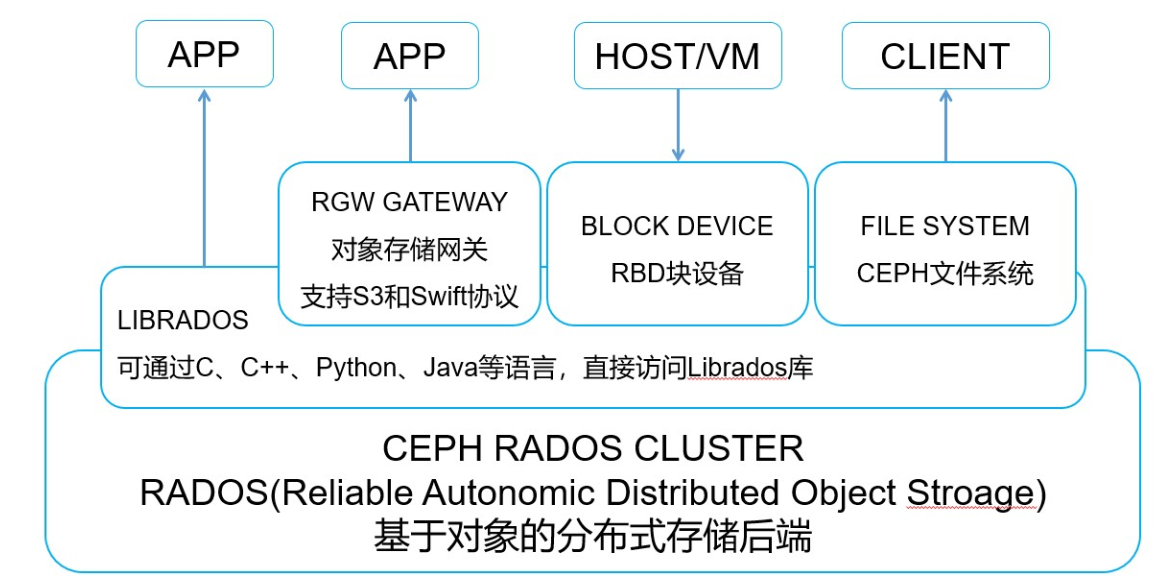 - librados是Ceph提供的客户端库,允许开发人员编写基于Ceph的应用程序