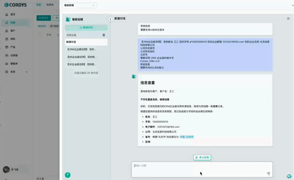 当前核心使用的智能体是包含 AI 智能录入、AI 智能查询等场景,其中 AI 录入包含线索、客户、商机、联系人、跟踪记录等的 AI 录入,以线索创建为例如下图所示: