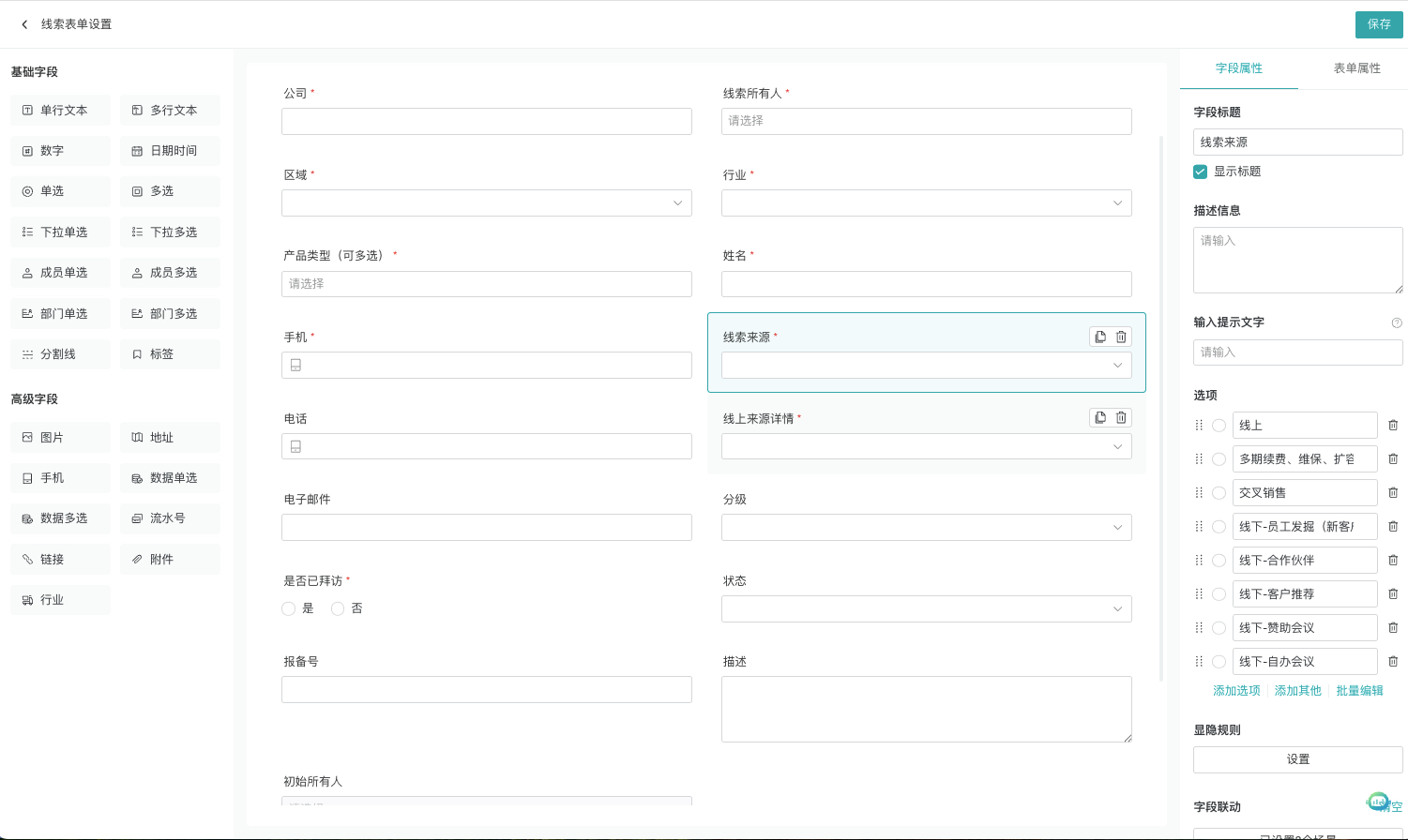 基于 Cordys CRM 的具体线索表单配置如下所示: