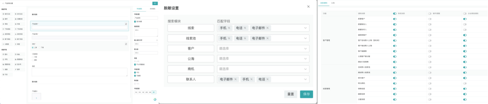 脱敏设置:脱敏设置则是在全局查询搜索时,不属于自己授权范围内的线索、线索池、客户、联系人、公海、商机等资源的某些字段进行脱敏设置,其中当前线索、线索池、联系人当前统一都配置了手机、电话、电子邮件的脱敏。