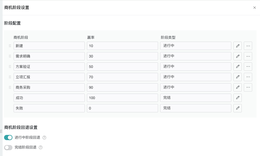 商机阶段在管理的过程中,分别如下图所示,包含4个核心阶段,其中进行中的阶段可以回退,但是完结阶段不得回退。当前在管理过程中如果遇到特殊案例则需要联系管理员进行特殊处理回退。