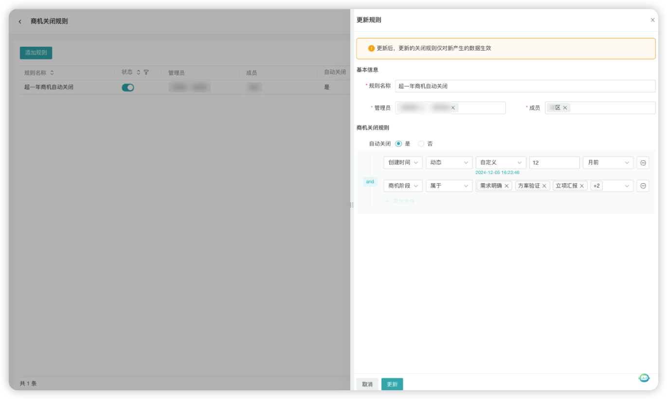 商机关闭规则同样根据不同部门可以独立设置关闭规则,当前部分部门设置了商机强制关闭规则。即按照创建时间大于12个月,且商机状态属于开放状态(即需求明确、方案验证、立项汇报、商务采购)等阶段的则统一回收。